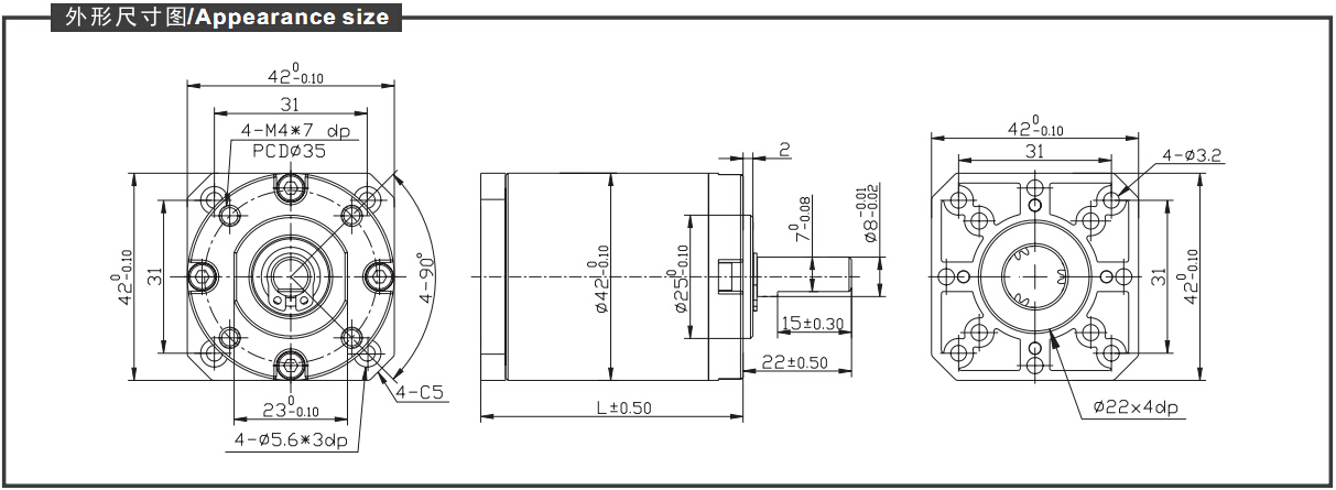輸出軸直徑為Φ8.0mm,長(zhǎng)度可根據(jù)客戶要求定制