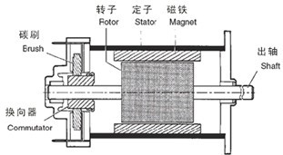 所以電機由固定的永久磁鐵(定子)一個轉(zhuǎn)動的磁鐵(轉(zhuǎn)子)和金屬外殼組成,形成電機體。(圖一) 根據(jù)異極相吸,(圖二) 同極相斥的原理,扭矩作用到轉(zhuǎn)子上使其轉(zhuǎn)動。當轉(zhuǎn)子磁極的軸向與定子磁極的軸向垂直正交時,扭矩最大,一旦轉(zhuǎn)子開始轉(zhuǎn)動,固定碳刷輪流與換向器保持接觸或中斷接觸。轉(zhuǎn)子線圈按轉(zhuǎn)子轉(zhuǎn)動的方式通電和斷電,轉(zhuǎn)子新產(chǎn)生的磁極的軸向,總是和定子磁極的軸向垂直正交,因為這是由換向器決定的。無論轉(zhuǎn)子在什么位置,都按固定方式運轉(zhuǎn)。通過增加換向器的數(shù)目來減少合成扭矩的脈動,可使轉(zhuǎn)子更加平滑地轉(zhuǎn)動。反接電機的電源,轉(zhuǎn)子線圈中電流產(chǎn)生的磁極N極和S極都將反轉(zhuǎn),作用于轉(zhuǎn)子上的扭矩也反向,從而電機改變轉(zhuǎn)動方向,根據(jù)其固有特性,DC電機是一種可反向轉(zhuǎn)動的電機。